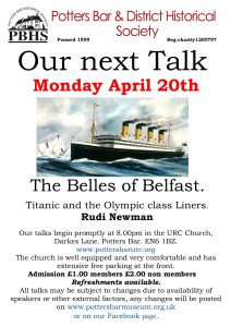 The Museum stewards are all volunteers from the Potters Bar and District Historical Society, and which is a registered charity (no. 1200797). Hertsmere Borough Council provides the Museum accommodation and also grant-aids most of the running costs. As well as running the Museum, the PB&DHS runs monthly evening meetings on a variety of historic topics every year from September through to May. They are held in the United Reform Church, Darkes Lane, Potters Bar, EN6 1BZ. Details and dates are listed on our Events page (click here).