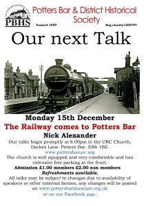 The Museum stewards are all volunteers from the Potters Bar and District Historical Society, and which is a registered charity (no. 1200797). Hertsmere Borough Council provides the Museum accommodation and also grant-aids most of the running costs. As well as running the Museum, the PB&DHS runs monthly evening meetings on a variety of historic topics every year from September through to May. They are held in the United Reform Church, Darkes Lane, Potters Bar, EN6 1BZ. Details and dates are listed on our Events page (click here).